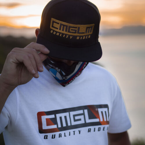 General: Camiseta blanca con detalles en naranja y negro carbono. Tiene un diseño geométrico minimalista de CMGLM, la marca de ropa hispana para moteros más reconocida, con la comunidad más grande del mundo. Las costuras laterales garantizan una caída y un estilo masculino.