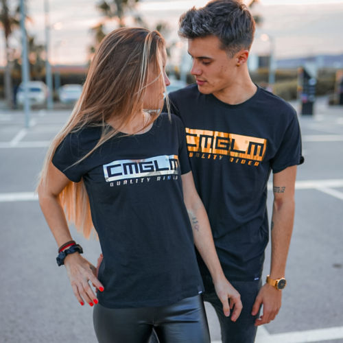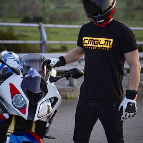 General: Camiseta negra con un diseño dorado minimalista de CMGLM, la marca de ropa hispana para moteros más reconocida, con la comunidad más grande del mundo. Las costuras laterales garantizan una caída y un estilo masculino.