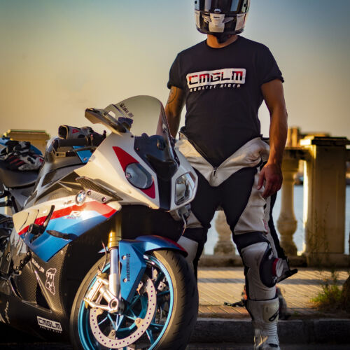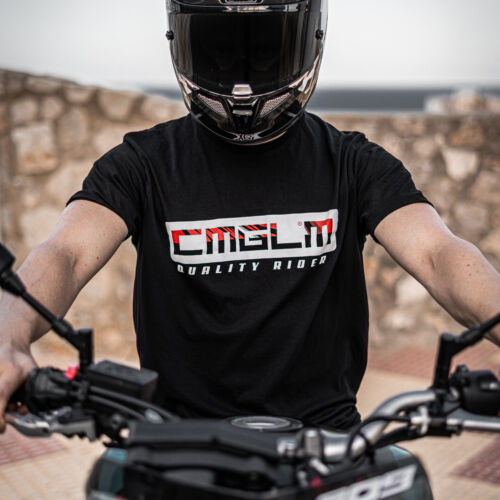 General: Camiseta negra con detalles en blanco y rojo. Tiene un diseño geométrico minimalista de CMGLM, la marca de ropa hispana para moteros más reconocida, con la comunidad más grande del mundo. Las costuras laterales garantizan una caída y un estilo masculino.