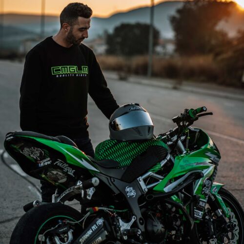 General: Sudadera de color negro y fluor, con diseño minimalista de la marca CMGLM, la prenda ideal para ser reconocidos como miembros de nuestra comunidad (la comunidad hispanohablante de moteros más grande del mundo). Es una prenda de gran calidad, perfecta para el uso diario. Diseñada para una larga duración.